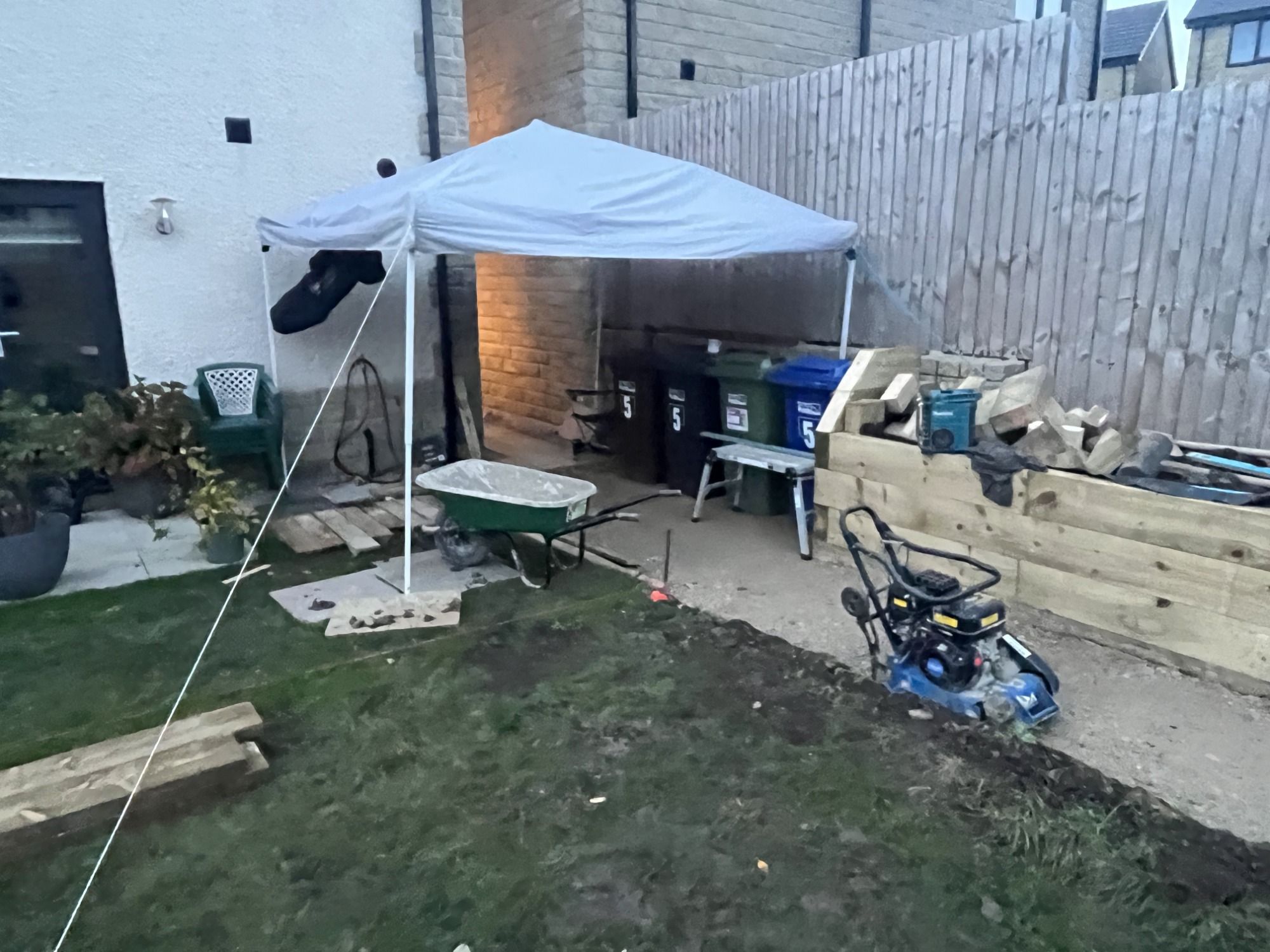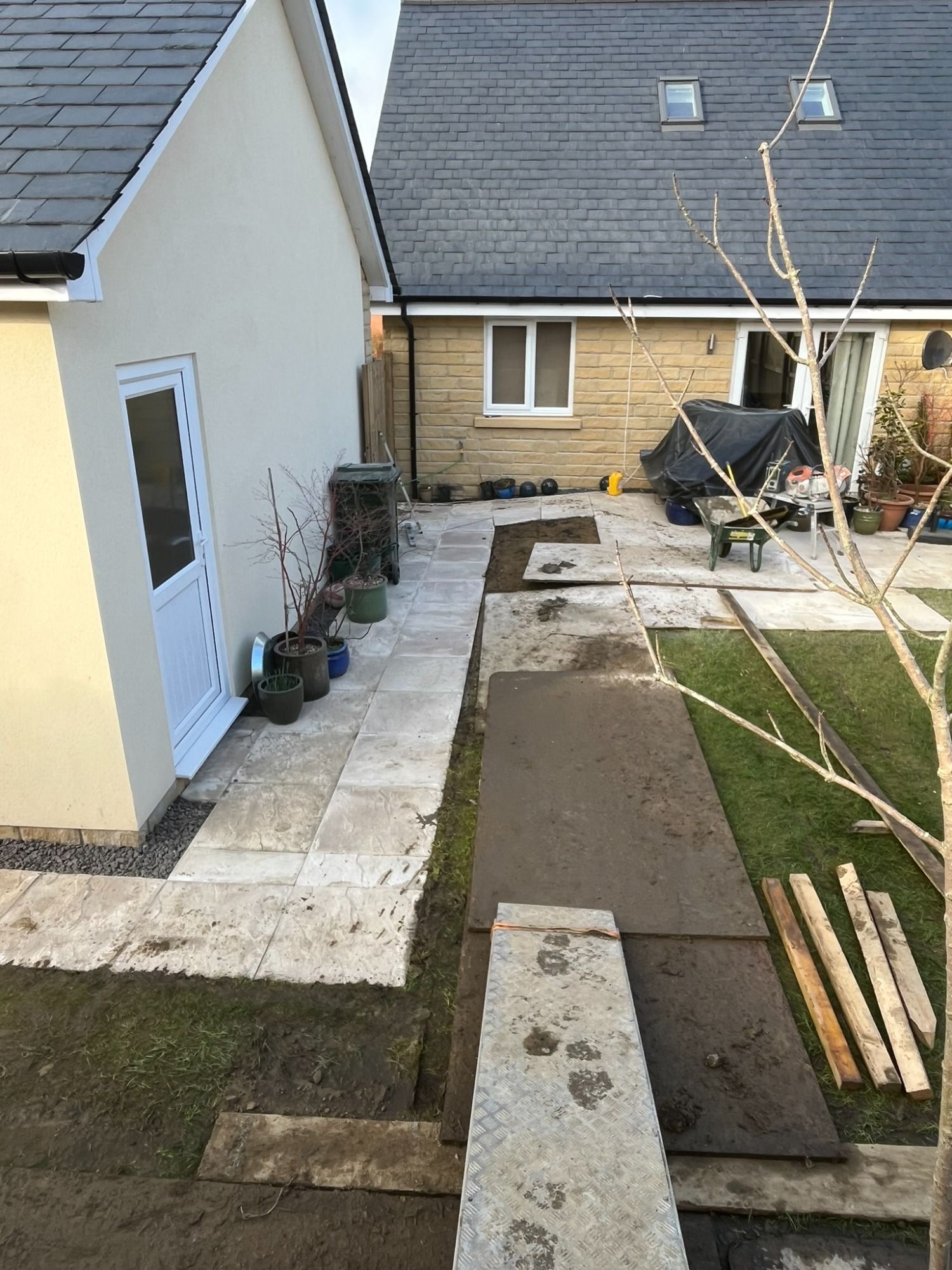 The paving done by the builders was minimal so they also wanted this joining to make the most of the usable patio area of the garden. The weather was terrible throughout the whole job so I needed to put down heavy duty boards so not to cause damage to the garden area. The planter has been finished off with some new small trees.