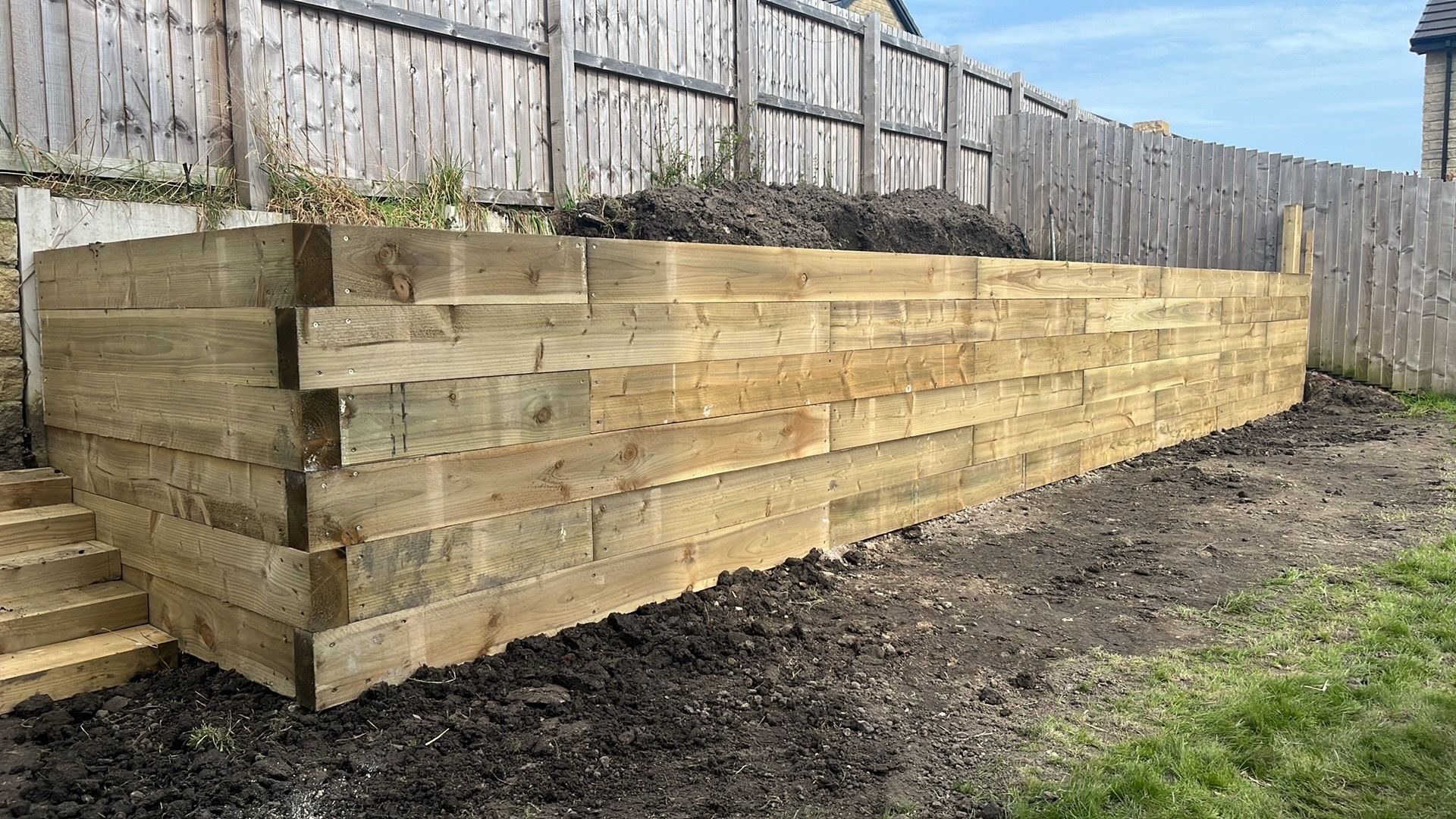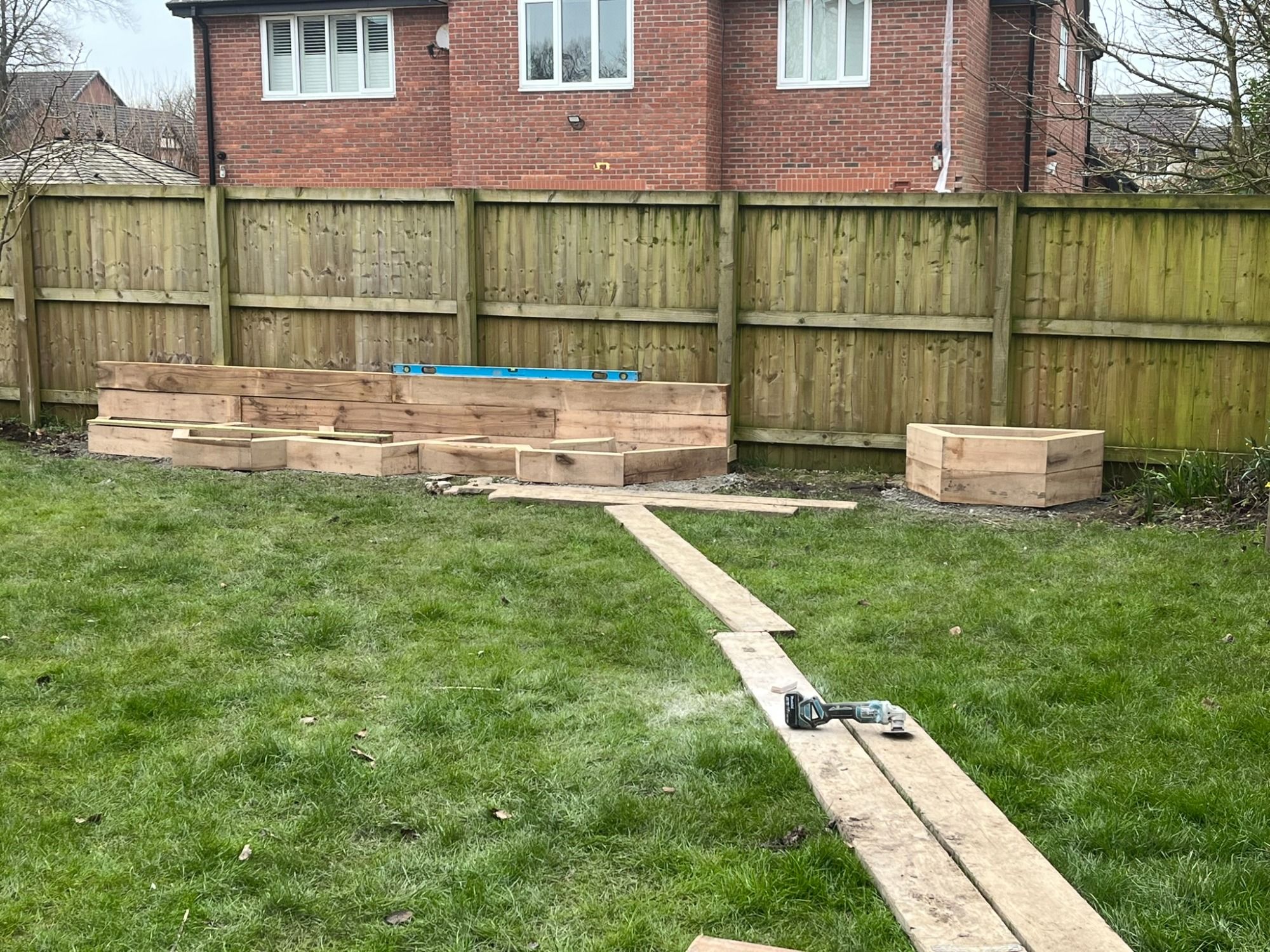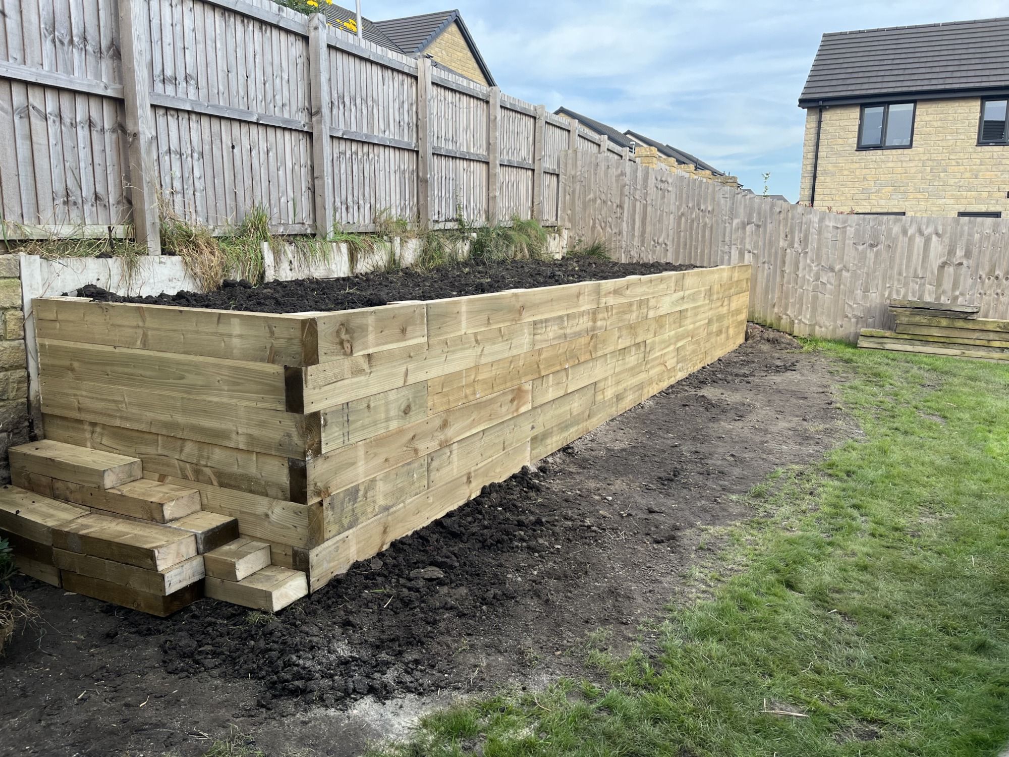 The garden is large but a completely blank canvas with a banking to the rear. The customer wanted a feature making of this banking by making it into one long planter which is held back with wooden sleepers. I've put a membrane between the soil and sleepers to ensure longevity of the sleepers and prevent premature rotting.