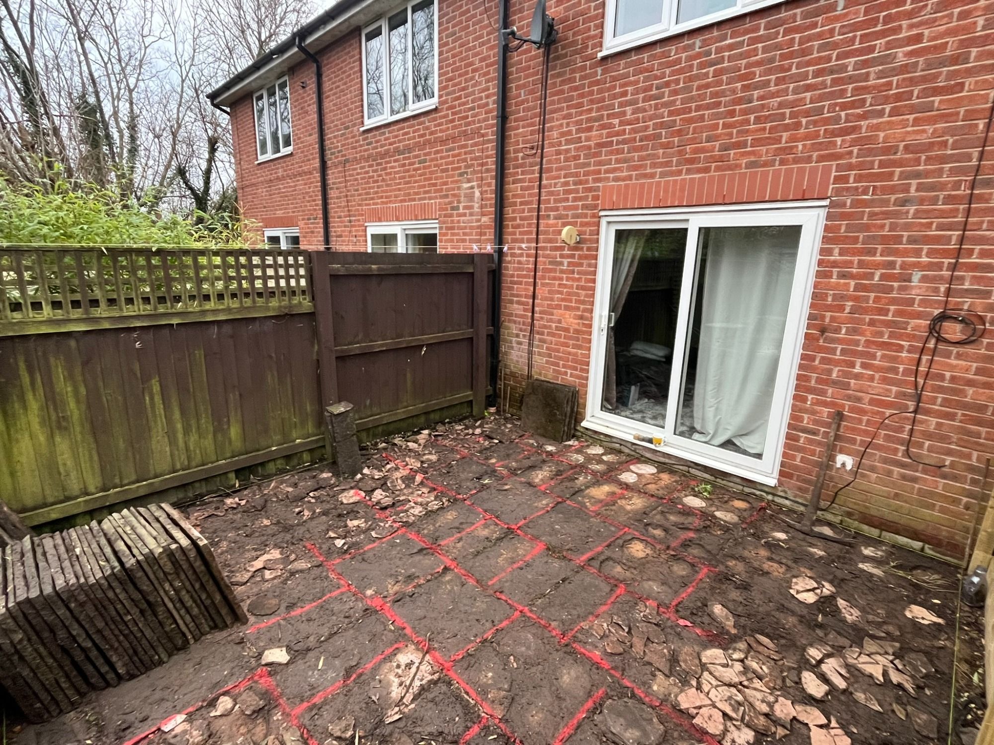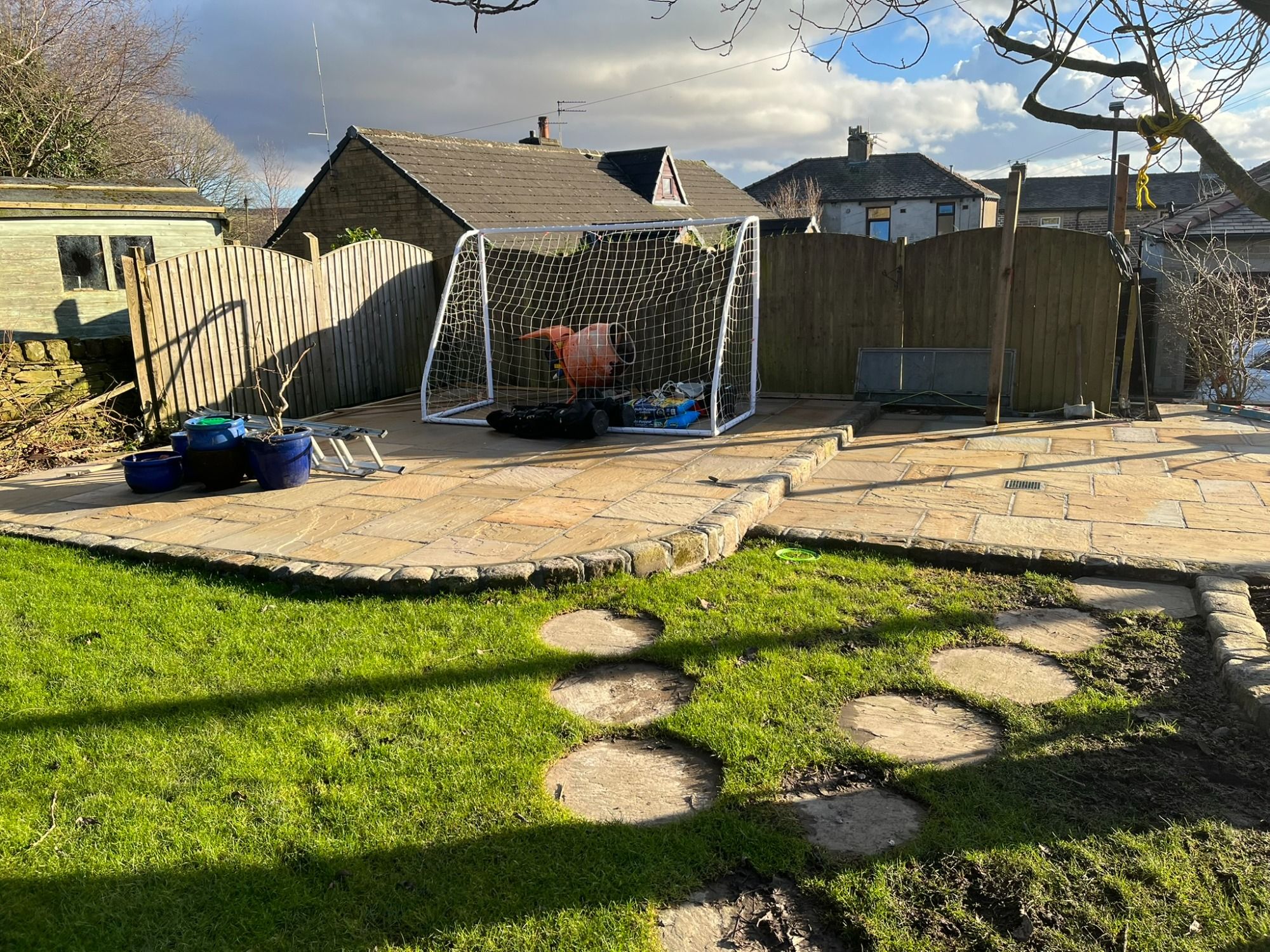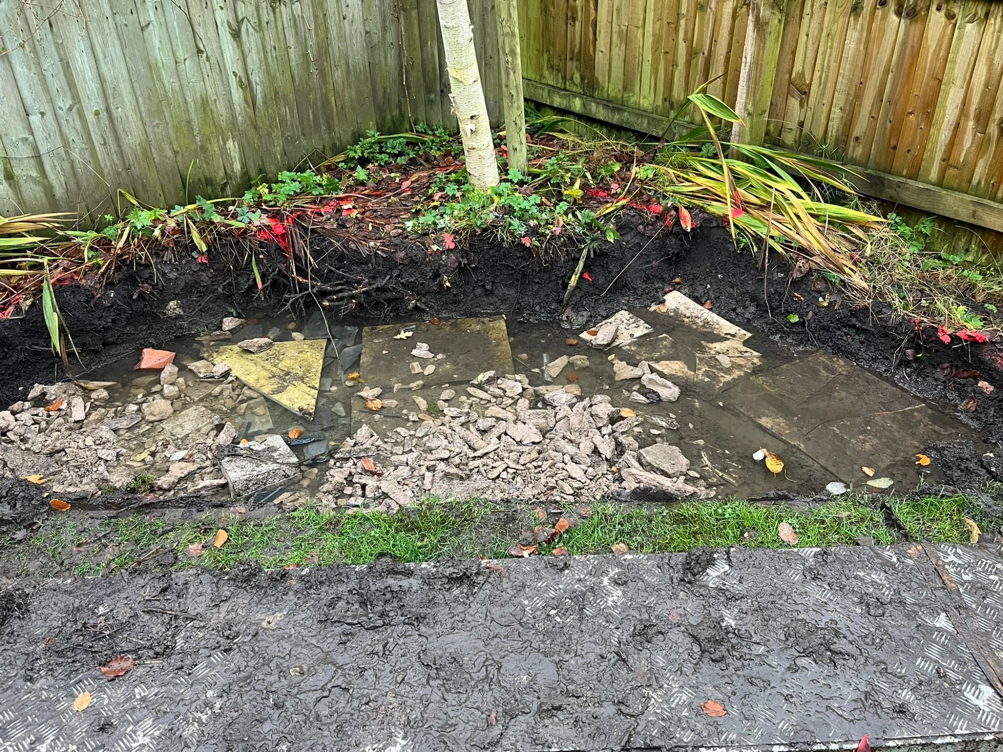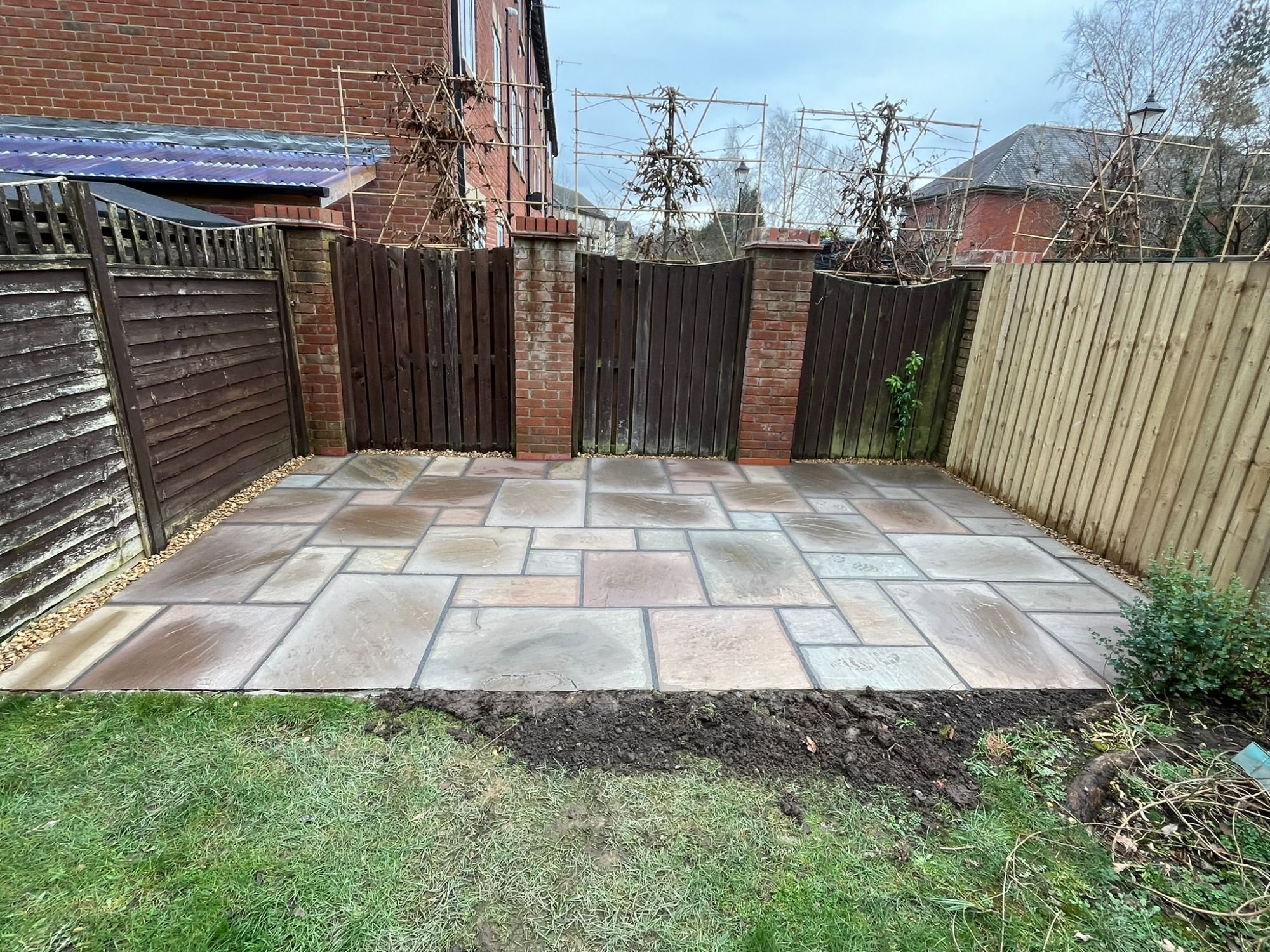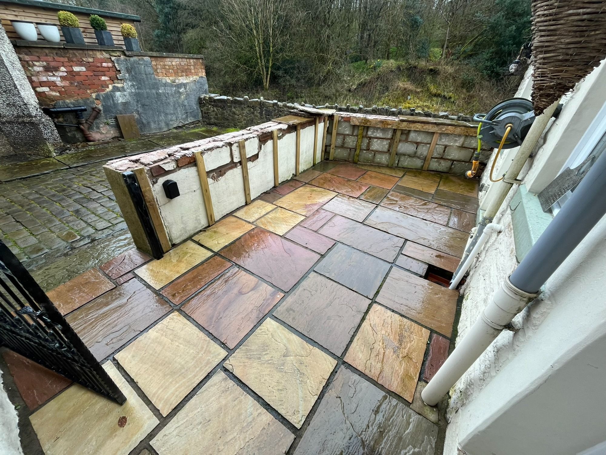The flags that had been previously laid were sinking and the customer wanted the whole patio extending, trees removing, retaining walls building, paving around a new shed, shrubs removing and a boundary fence installing..