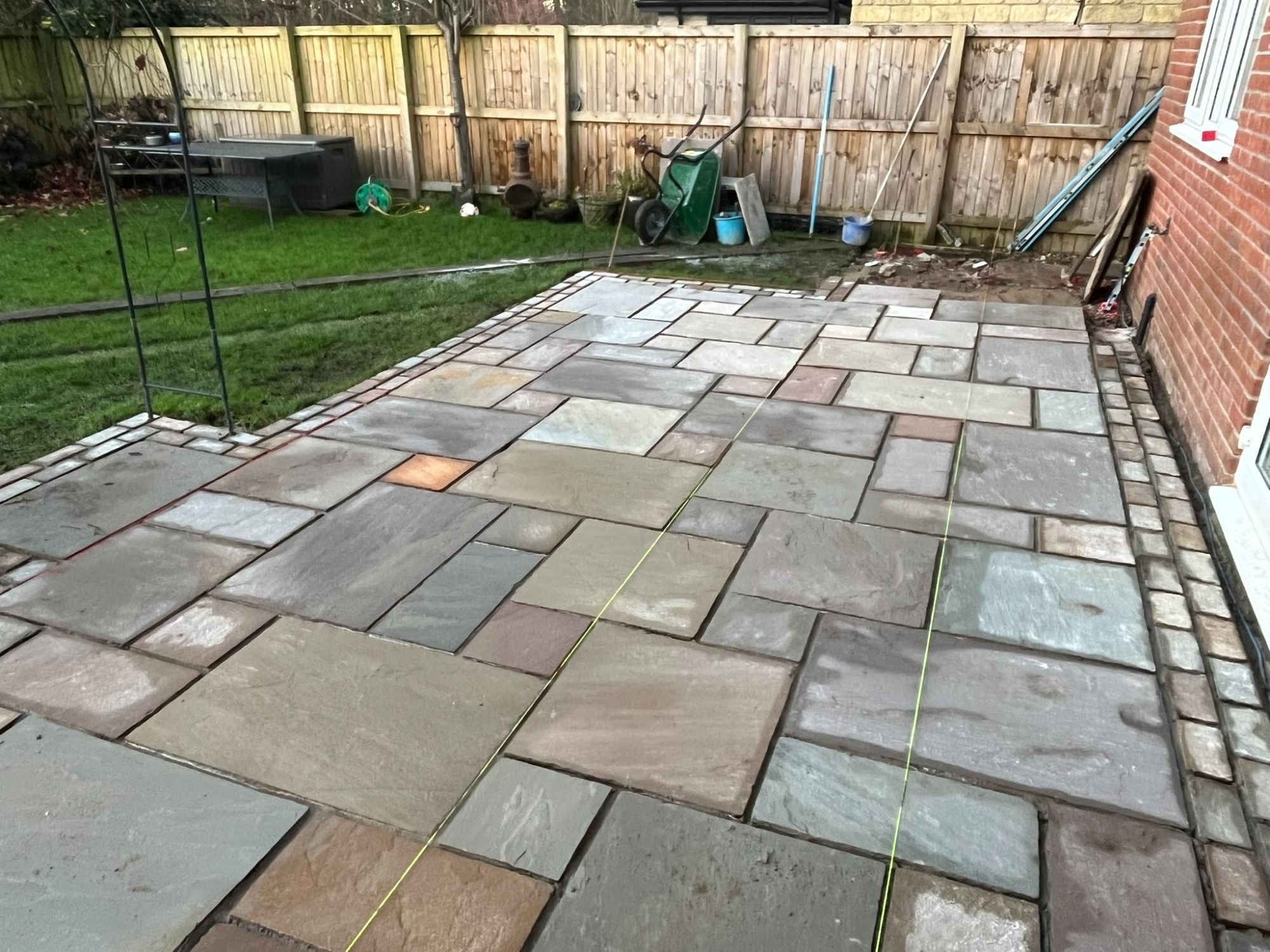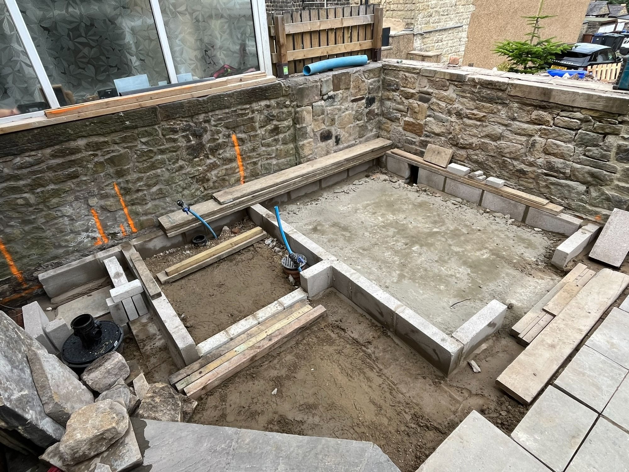She'd had a large extension to her bungalow and the garden, as it was on a slope, make it difficult to use. There was steps to the far side that she wanted rid of, to extend the patio so she could put up a summer house. As it was traditional York Stone, she wanted this matched to. It's difficult to work with, as all the stone is a natural different depth.