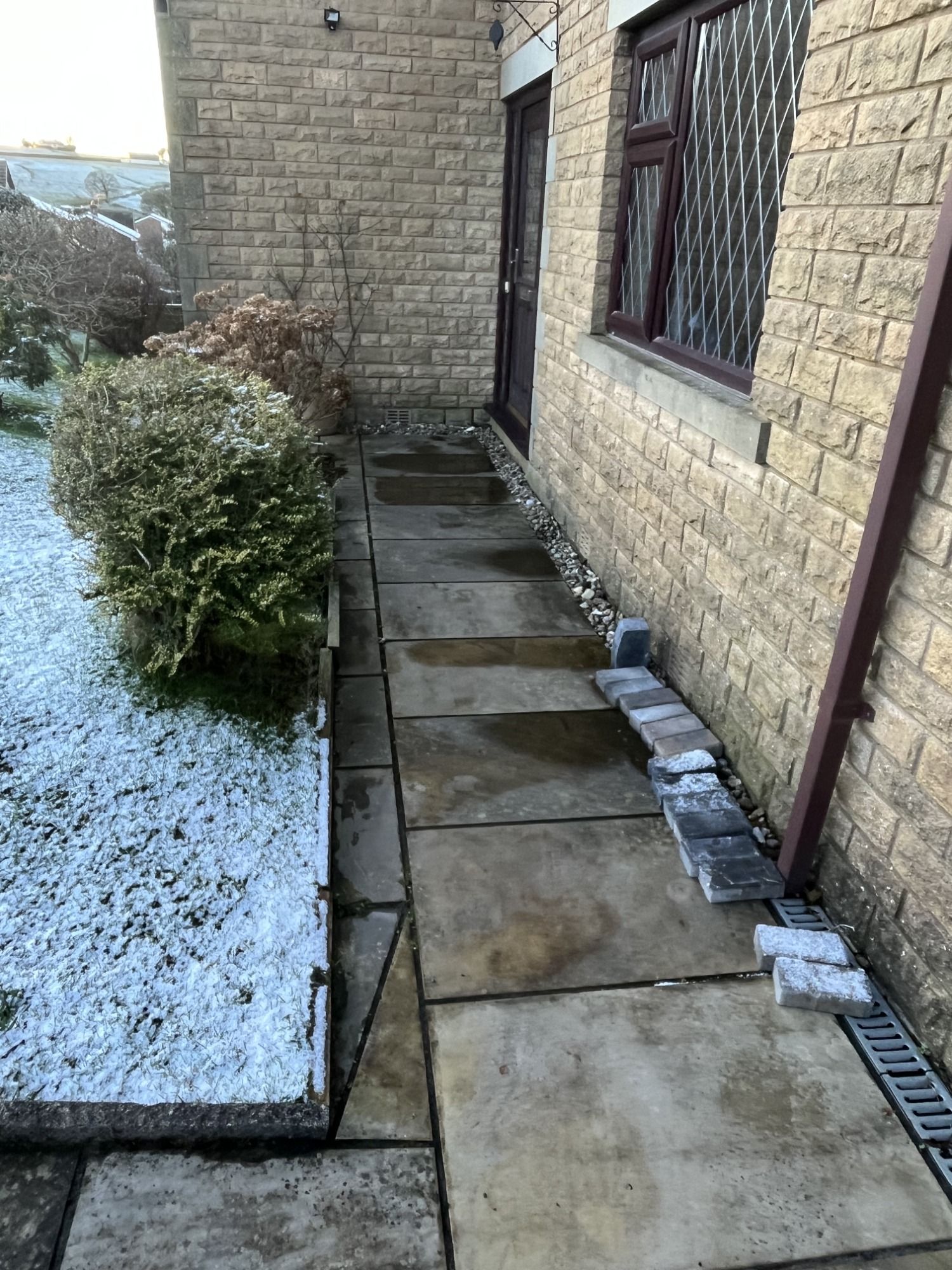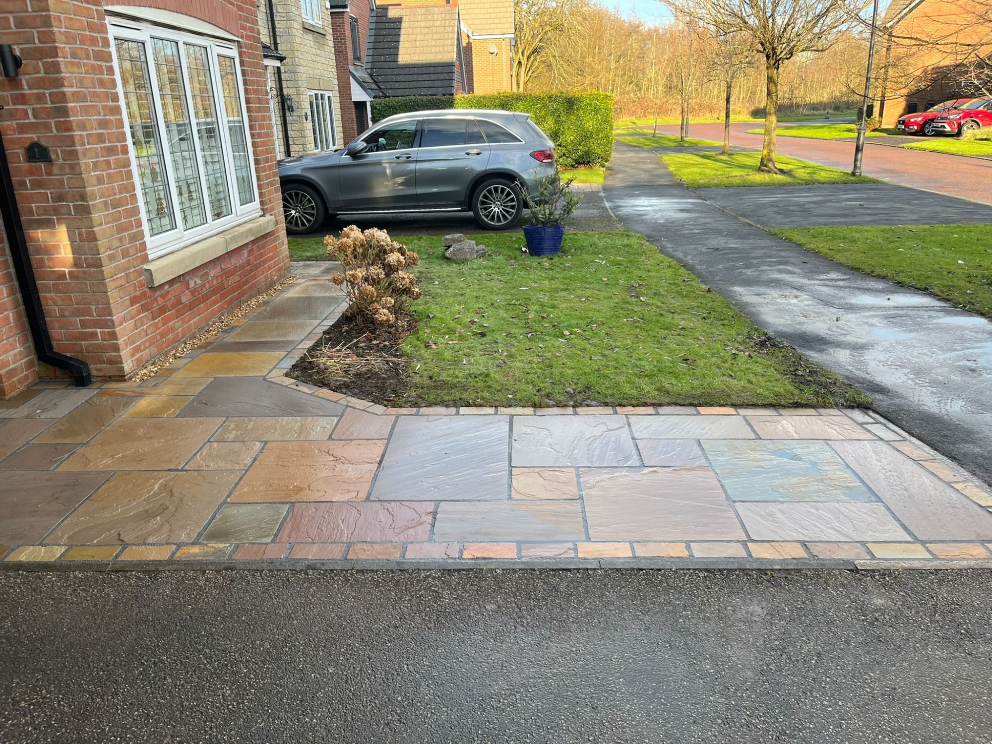 The drive was flagged, but as it was on a slope, they found that it became very slippery and dangerous, in a short space of time. I took up the flags and replaced with block paving. They also asked me to continue this across the front of the house, so it all matched.
